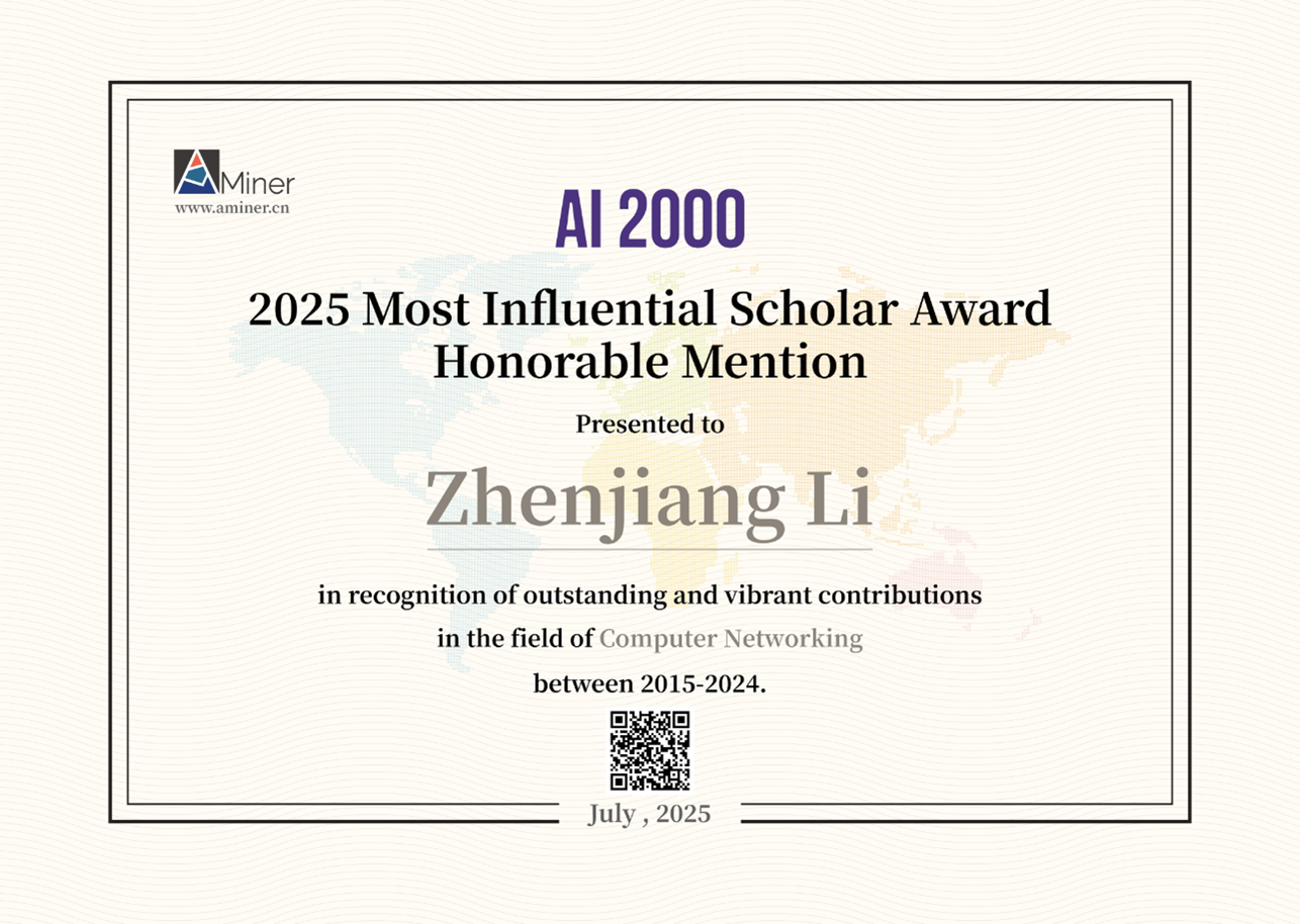 Prof Zhenjiang LI has been included in the 2025 AI 2000 Global Artificial Intelligence Scholars List and received the 2025 AI 2000 Most Influential Scholar Award Honorable Mention, recognising his outstanding research contributions in Computer Networking through impactful publications from 2015 to 2024.