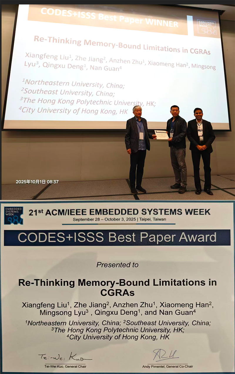 Prof Nan Guan, together with Mr Xiangfeng Liu, a former Research Assistant at CityUHK, and scholars from Northeastern University, China, Southeast University, China, and the Hong Kong Polytechnic University, have received the Best Paper Award at the International Conference on Hardware/Software Codesign and System Synthesis (CODES+ISSS). The co-authored paper titled “Rethinking Memory-bound Limitations in CGRAs” was recognized in the Conference held from 28th September to 3rd October 2025 in Taipei, Taiwan.
