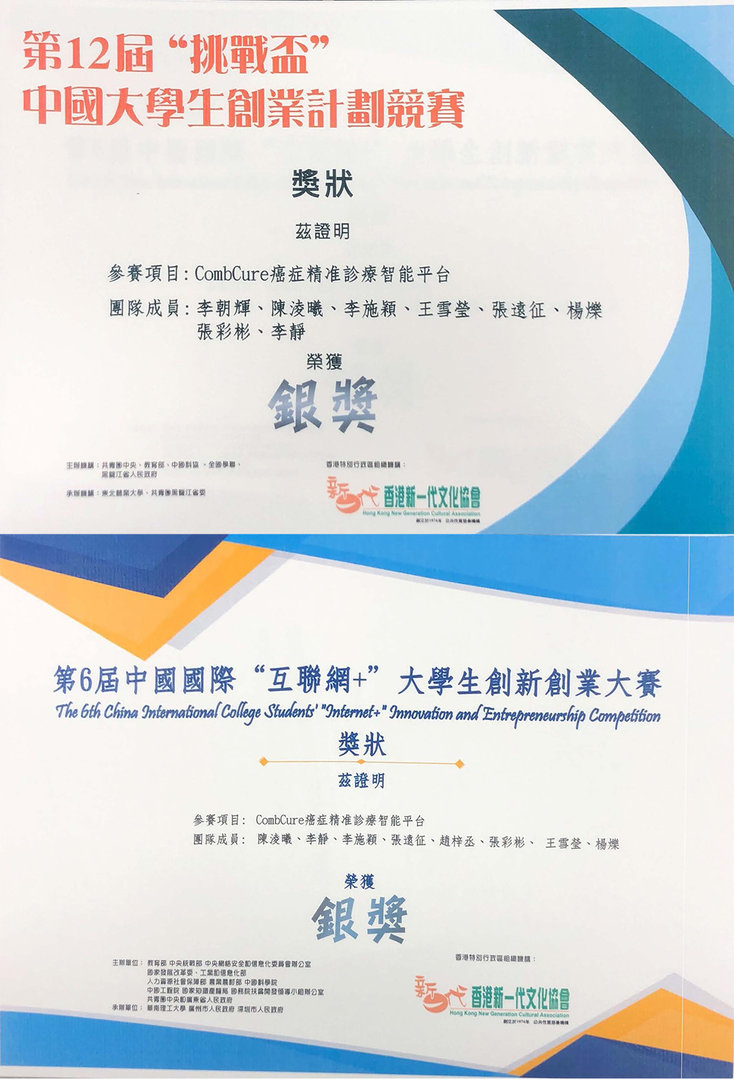 Silver Prize in 12th Challenge Cup – National Business Plan Competition for College Students and 6th China International College Students' “Internet +” Innovation and Entrepreneurship Competition