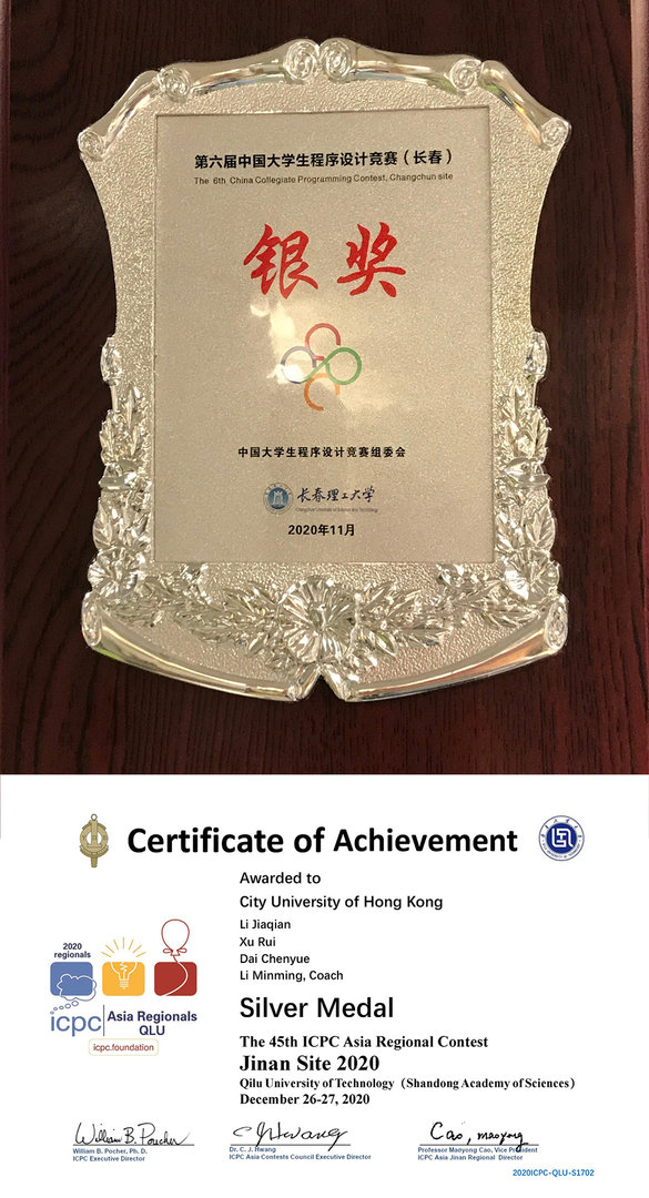 A team of BSc Computer Science students comprising Mr DAI Chenyue, Mr LI Jiaqian and Mr XU Rui won the Silver Medal in the 45th International Collegiate Programming Contest (ICPC) - Asia Regional Contest (Jinan Site) 2020 held virtually in December 2020, under the supervision of Prof Minming LI and Dr Kenneth LEE. The same team of students also received the Silver Medal in the 6th China Collegiate Programming Contest (Changchun Site) held virtually in November 2020.