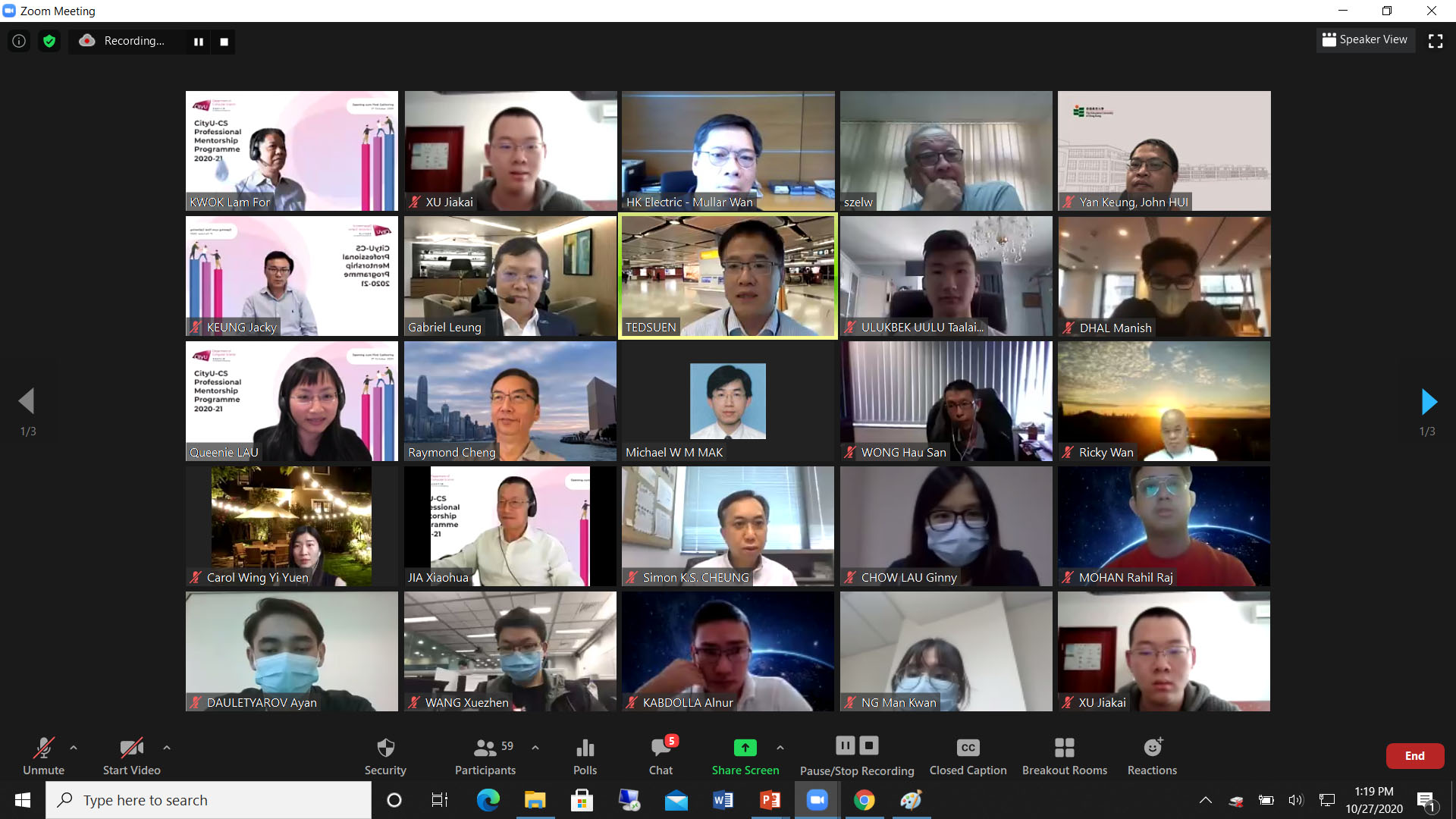 The virtual Opening cum First Gathering of CityU-CS Professional Mentorship Programme 2020-21 was held on 27 October 2020 to provide an online platform for mentors and mentees for sharing and interaction. We were honored to have Mr Raymond Cheng, the former Chairman of the Departmental Advisory Committee (DAC) and the initiator of the Programme, and Prof Ted Suen MH, the current DAC Chairman, delivering the opening remarks to kick-start this year’s Programme. Over 60 students, mentors and staff participated in this virtual gathering.