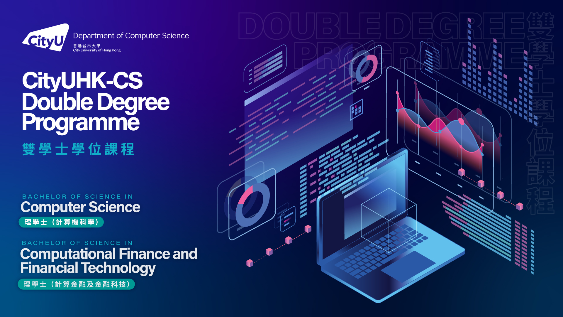 Jointly offered by the Department of Computer Science and the College of Business, the programme aims to educate a new generation of professionals with a unique combination of expertise from the important areas of computer science, computational finance, and financial technology. Finance is one of the pillars supporting the economy of Hong Kong, and the use of computational technologies has become pervasive in different business sectors. With recent significant advances in artificial intelligence (AI) and blockchain technologies and their increasing applications in every aspect of the financial industry, the new programme, which comprises a broad set of courses from the Department of Computer Science and College of Business, will train students with a distinctive and interdisciplinary blend of knowledge across the complete spectrum of computer science/computational finance/financial technology areas, from AI, big data analytics, derivatives pricing, financial econometrics, portfolio management to software engineering.