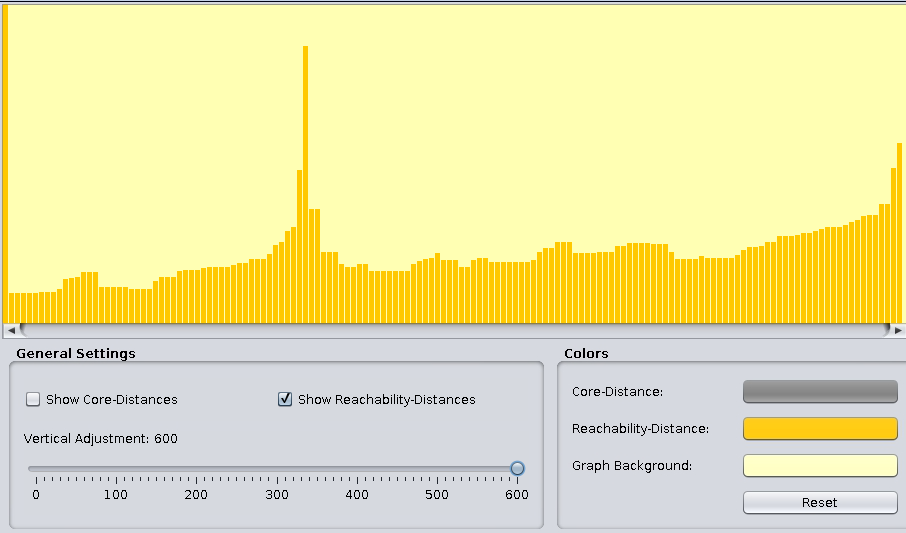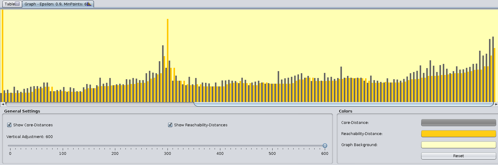 The Graph tab shows the stem plots of core and reachability distances. We need to increase the Vertical adjustment in the General Settings panel to see the variations more clearly: