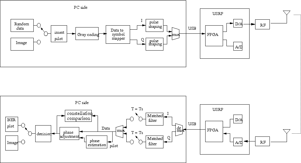 In the receiver side, both RF module and USRP perform the reversed roles as their transmitter counterparts. The received digital signals are filtered by matched filters and sampled at sampling time in I/Q branches respectively. In an indoor environment, the wireless channel between two USRP boards is mostly like a flat fading channel. So, we need channel estimation to estimate the channel information and source data are adjusted by estimated phase. The received signal constellations of both with and without adjustment are dynamically showed in the simulation. User may choose to plot constellation or not in the program, and if they choose to plot constellation, they may also set the SNR for the constellation.