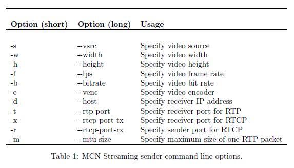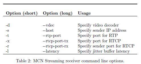 Specify Receiver IP AddressDefault value is 127.0.0.1 (localhost). Specify Receiver Port for RTPDefault value is 5000. Specify Receiver Port for RTCPDefault value is 5001. Specify Sender Port for RCTPDefault value is 5005. Specify Maximum Size of One RTP PacketDefault value is 1024 (in bytes). Receiver OptionsAbove table is a complete list of MCN Streaming receiver options. Below we list the default and possible alternative values for each option. Specify Video Decoder- Default value: ffdec_h264.