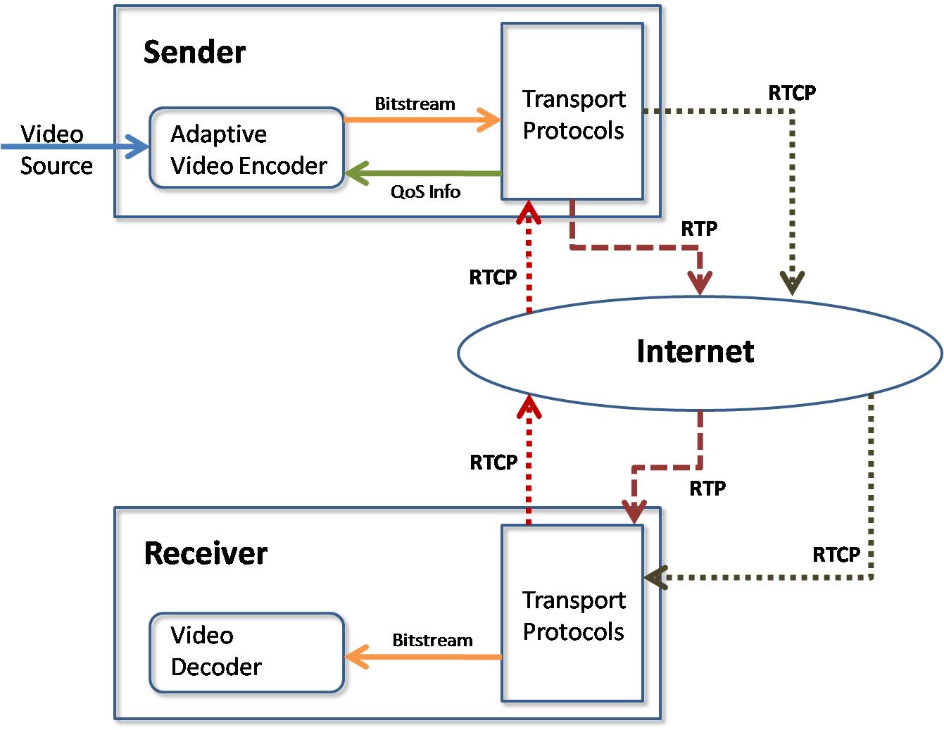Above figure shows the high level overview of the MCN Streaming architecture. MCN Streaming consists of two components: a sender and a receiver. Sender is responsible for video encoding and transport layer packet encoding, while receiver is responsible for transport layer packet decoding and video decoding. Encoded packets travel through the Internet. Receiver also sends feedback to receiver via RTCP packets. The feedback (QoS information) is used by video encoder to adjust its encoding parameters on-the-fly. By doing this, video encoder adapts to the instant channel conditions and better video quality is expected at the receiver side. |