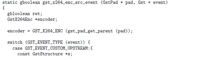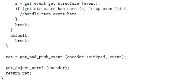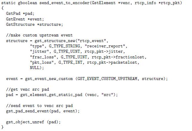 This "rtcp_event" will then be consumed by the video encoder. Since it is a custom event, if we are using an existing video encoder element (e.g., x264enc), we need to modify the element accordingly to handle the custom event. Following code snippet is an illustrative example, based on GStreamer x264enc plug-in.