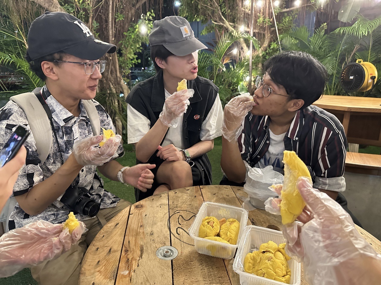 Welcome to our first station of the durian’s journey. After exiting the MRT station, we could already notice the unique smell of the Mao Shan Wang. It is so expressed that the durian shop has a grand declaration, and the customers can taste diverse fresh durians such as Black Gold Mao Shan Wang, Mao Shan Wang, Jin Feng, D13, S17, XO, and Red Prawn (D175), and also the durian desserts here.