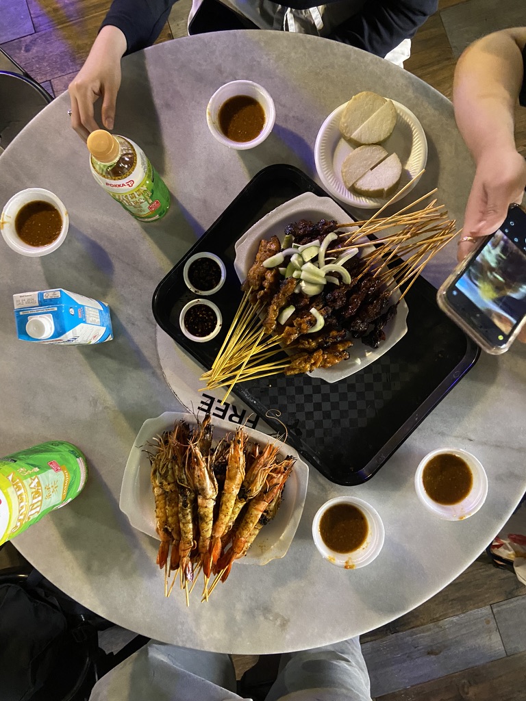 Adjacent to the food court, we discovered a road filled with food tables and kiosks where sellers cooked skewers on top of barbecue grills. We couldn’t resist trying a set of skewers, which included shrimp, chicken, and beef, accompanied by rice cake, sweet and spicy soy sauce, and peanut sauce. The succulent shrimps were particularly delicious.