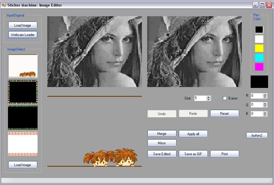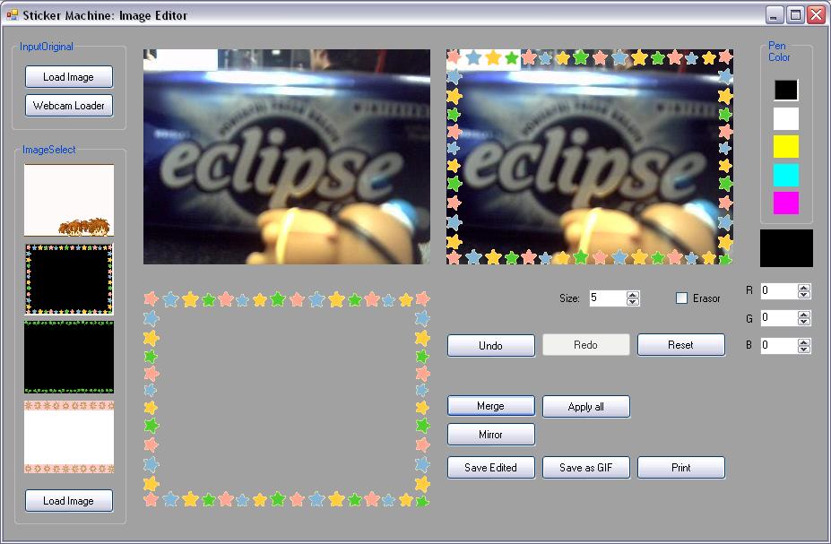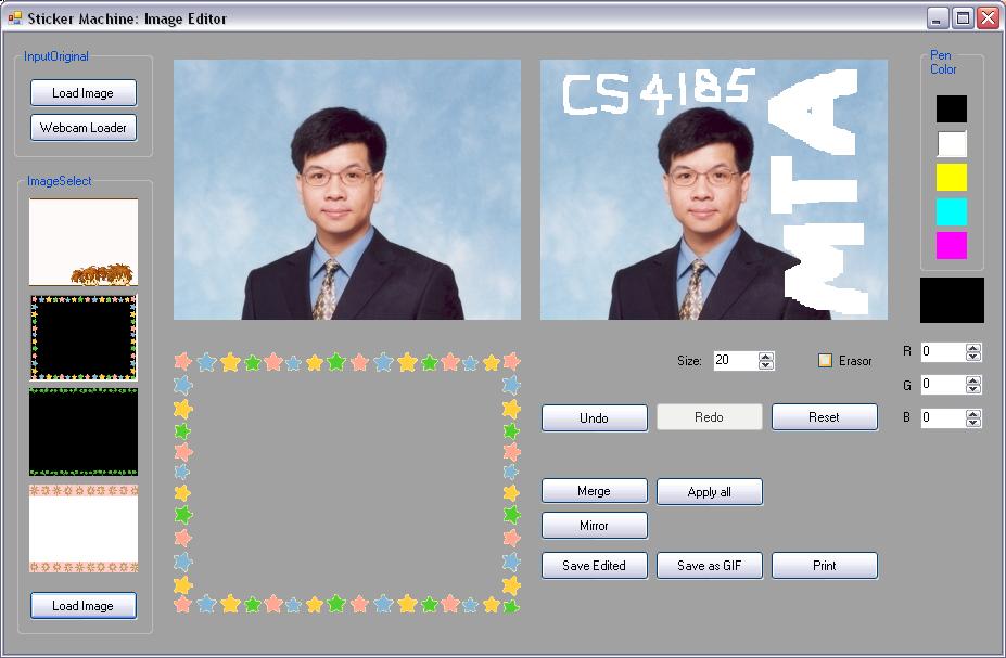 The project will focus on image processing technique. We will work on a simulator of a sticker machine on computer. Users can input an image in computer or through a webcam. After loading the image into the system, users can enrich the image by inputting text or filling up the background with funny cartoons or objects. Finally, users can choose to output the image as a file or print the image out. For printing the images out as sticker, the system provides a template which is in a well defined size for users to place the images. For more advance function, user can use the webcam to capture several images continuously and edit each image. User can choose to output as a gif file which combines the edited images together.