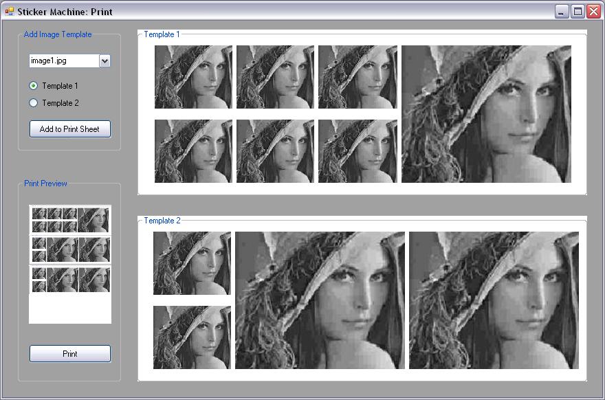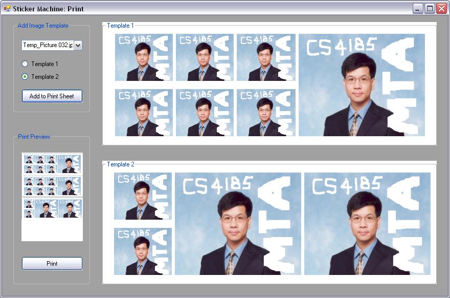 Click the "Print" button of the Image Editor interface. The Print Template interface will be prompted up. User can choose the image that he/she wants to print from the drop down list box (only the Temp_Picture 00X and Picture 00X_Edited JPEG file name can be chosen). Users can choose to print either Template1 or Template2. After clicking the "Add to Print Sheet" button, the Print Preview which in A4 size will show the added template. After adding 4 templates or clicking the "Print" button of the Print Template interface, the machine will call the window print function for printing.