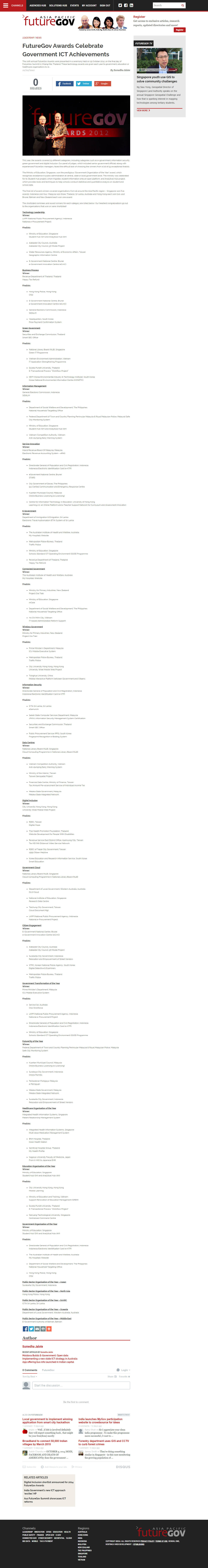 The sixth annual FutureGov Awards were presented in a ceremony held on 19 October 2012, on the final day of FutureGov Summit in Chiang Mai, Thailand. These technology awards are given each year to government, education or healthcare organisations to recognise and celebrate the most successful modernisation programmes in the region. [image]