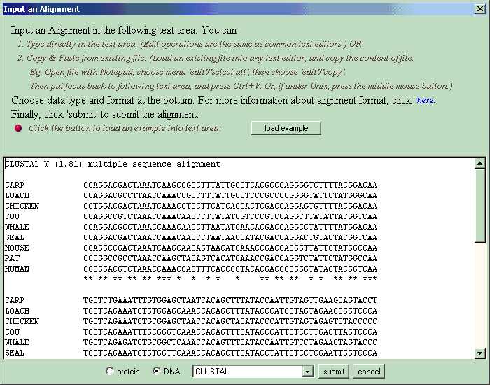 'load example' in the input dialog, and then choose 'Clustal' in pop-up