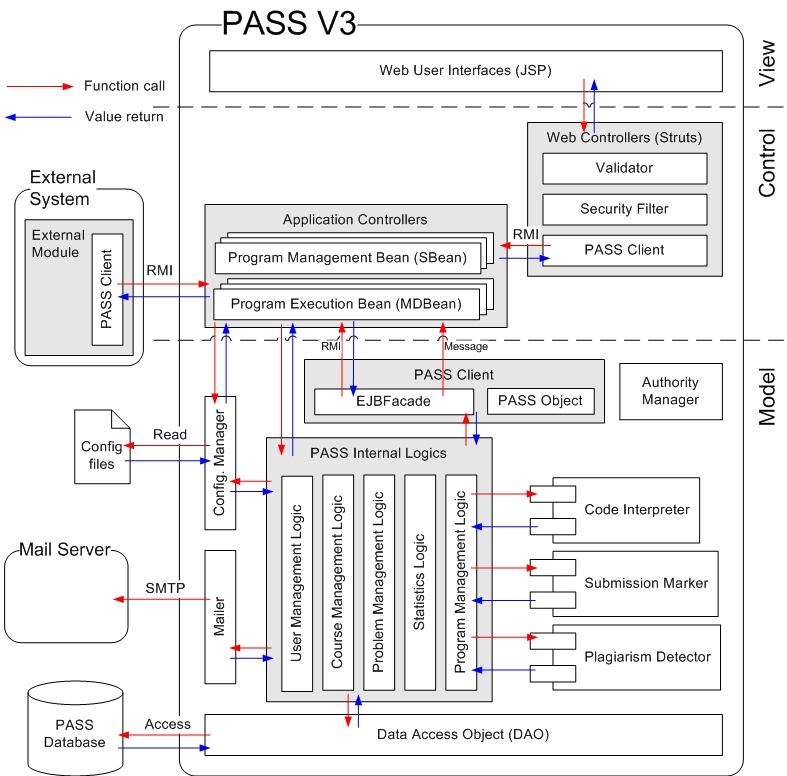 PASS uses JBoss as the application server. It can hold the Enterprise Java Beans and listen to RMI callis from external systems. In PASS V3, a client lib (passEJB-client.jar) is provided to external systems for access to the features of PASS.