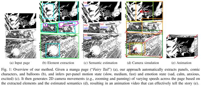 Abstract: We propose a method for animating still manga imagery through camera movements. Given a series of existing manga pages, we start by automatically extracting panels, comic characters and balloons from the manga pages. Then, we use a data-driven graphical model to infer per-panel motion and emotion states from low-level visual patterns. Finally, by combining domain knowledge of film production and characteristics of manga, we simulate camera movements over the manga pages, yielding an animation. The results augment the still manga contents with animated motion that reveals the mood and tension of the story, while maintaining the original narrative. We have tested our method on manga series of different genres, and demonstrated that our method can generate animations that are more effective in storytelling and pacing, with less human efforts, as compared with prior works. We also show two applications of our method, mobile comic reading and comic trailer generation.