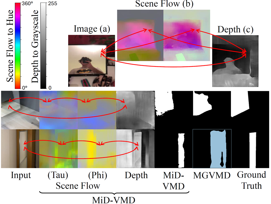 3D motion (b), and depth (c). These complementary cues, shown across columns