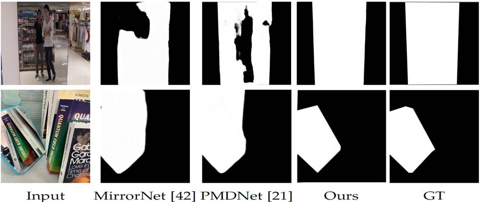 Mask RCNN [12] wrongly detects objects inside the mirrors (c). With